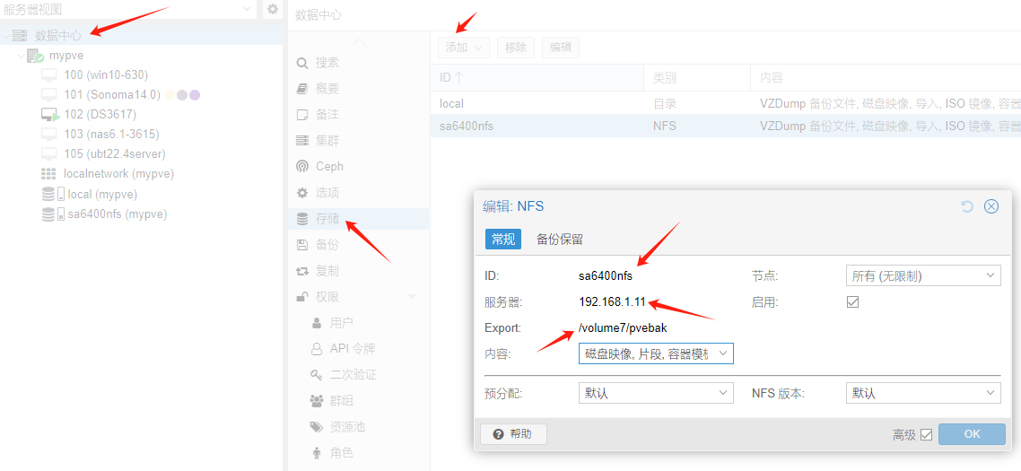 通过以上步骤,你已经成功地将Proxmox (PVE) 与群晖NAS通过NFS连接,并将NFS用作虚拟机的备份盘。这种方法不仅提高了存储的灵活性和可扩展性,还充分利用了群晖NAS的文件共享和备份功能。